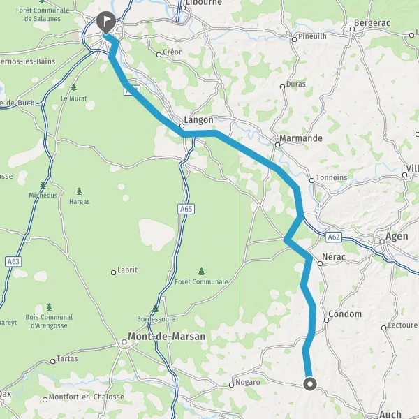 Prendre à droite et rejoindre A65 E7. Continuer sur 30 kilomètres