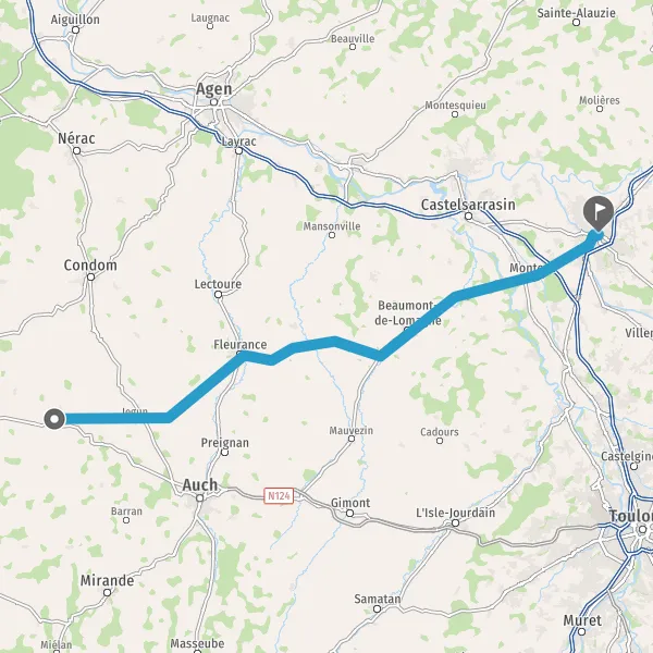 Tourner à droite sur D103 (Route de Jegun) et continuer sur 13 kilomètres