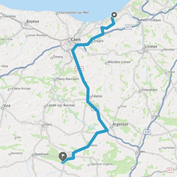 Au rond-point, prendre la 3ème sortie sur N158 (Route de Falaise) et continuer sur 28 kilomètres