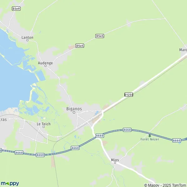 Affichez sur la carte les pistes cyclables pour la ville de Biganos (33380). Les différents aménagements cyclables, comme les voies vertes, les véloroutes et les voies partagées sont pris en compte sur les tracés de carte.