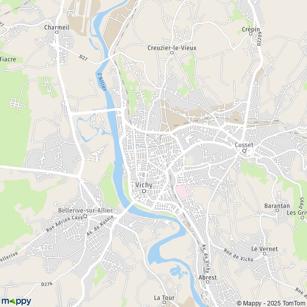 Vichy est une commune française située dans le département de l’Allier et la région Auvergne-Rhône-Alpes (anciennement région Auvergne). Elle faisait partie de l'ancienne province du Bourbonnais. Selon le recensement de l'Insee de 2014, Vichy est la deuxième commune du département après Montluçon avec 25 279 habitants, et la quatrième de la région après Clermont-Ferrand, Montluçon et Aurillac. Ses habitants sont appelés les Vichyssois. Vichy devient la capitale estivale de la musique en France au début du XXe siècle, mais la guerre de 1914 met un coup d’arrêt brutal à ce développement. Suite à l’armistice signé le 22 juin 1940, le gouvernement s’installe à Vichy. Sa relative proximité avec Paris, ainsi que la deuxième capacité hôtelière du pays présente dans la ville, emportent la décision de l’installation. De plus, la ville est dirigée par l’État français par l'entremise de la Compagnie fermière de l'établissement thermal de Vichy. À partir de cette date, Vichy est, pendant plus de quatre ans, le siège du Gouvernement français et marquera au fer rouge la cité. Les années 1950 et 1960 ont été la période la plus faste pour Vichy, qui voit défiler personnalités, têtes couronnées, et bénéficie de l’arrivée massive de la clientèle des français d’Afrique du Nord, qui se retrouvent en vacances à Vichy, et dépensent beaucoup d'argent. La toile Vichy à gros carreaux fut notamment à la mode dans les années 60. Mais la guerre d'Algérie, suivie de la décolonisation, marque une nouvelle fois un coup d’arrêt brutal pour la ville qui doit désormais s’adapter à une nouvelle donne beaucoup moins favorable, et adopter une politique de gestion beaucoup plus prudente. Aujourd'hui, la ville est renommée pour ses cures thermales, depuis le temps des Romains. Ses eaux sont célèbres dans le monde entier (sources Vichy Célestins, Vichy Saint-Yorre), mais les pastilles confectionnées à partir de la soude contenue dans les eaux de source sont également réputées.