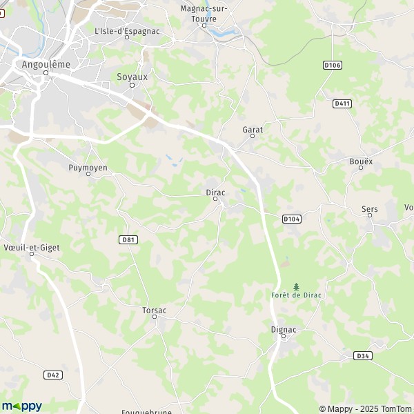 Dirac fait partie du département de la Charente et de la région Nouvelle-Aquitaine (anciennement région Poitou-Charentes). Entouré par les communes de Garat, de Sers et de Torsac, ce village se trouve à moins de dix kilomètres d'Angoulême. Ses habitants sont appelés les Diracois et les Diracoises.