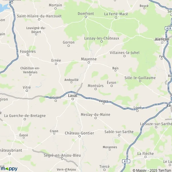 Sur la carte vous pouvez aussi afficher : Info trafic MayennePistes cyclables Mayenneles ZFE Mayenne